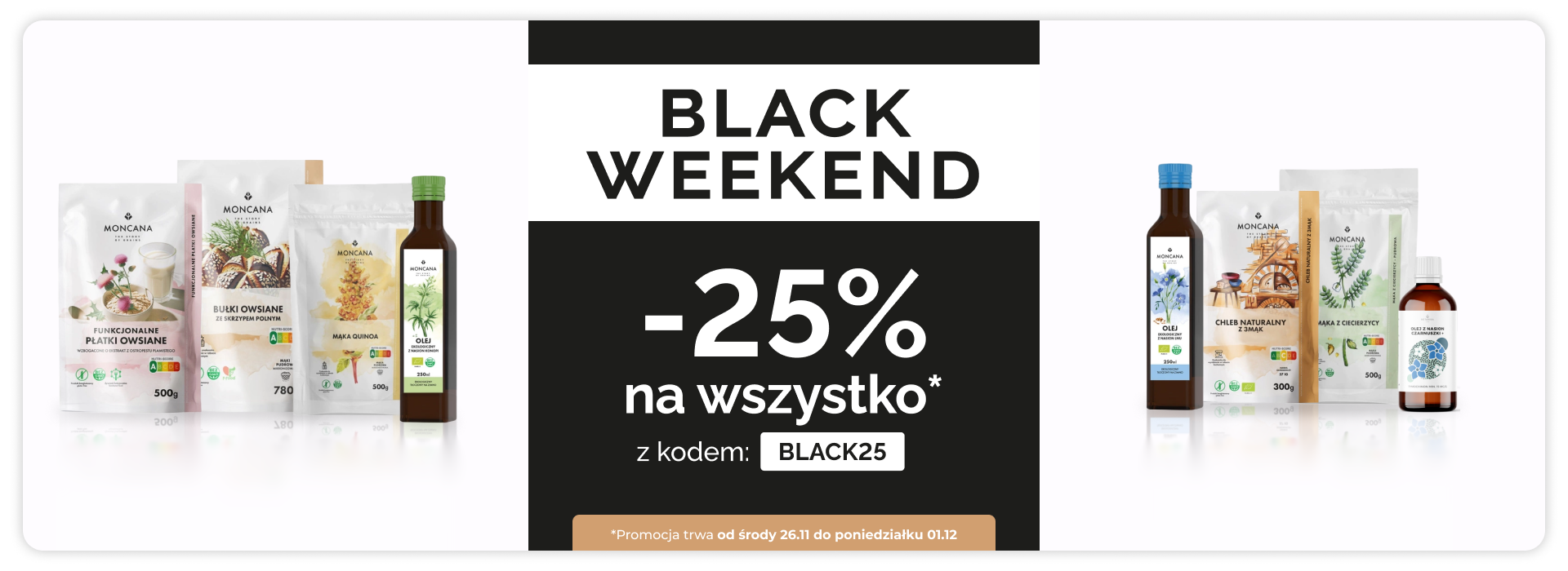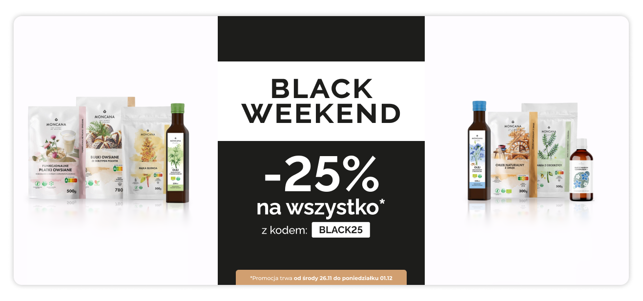 MONCANA to sklep z żywnością ekologiczną, gdzie znajdziesz starannie dobrane produkty bez sztucznych dodatków, które wspierają zdrowy styl życia. Dla nas zdrowe jedzenie to takie, które wspomaga Twój organizm, jest wolne od sztucznych dodatków i konserwantów. Jako sklep z żywnością bezglutenową oferujemy produkty dla osób dbających o dietę w celiakii (bezglutenową) oraz dla tych, którzy mają nietolerancje pokarmowe. Staramy się, aby każdy mógł cieszyć się naszymi produktami bez obaw o obecność niechcianych składników. Nasze pudrowe mąki, kasze i oleje tłoczone na zimno są doskonałą bazą do przygotowania pełnowartościowych posiłków, które zaspokoją gusta każdego smakosza, zapewniając jednocześnie niezbędne wartości odżywcze dla wspierania zdrowego trybu życia.