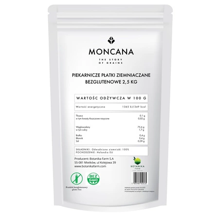 Potato flakes are a product obtained from boiled and then dried and crushed potatoes. They are distinguished by their neutral taste, loose texture and wide use in cooking. They make an excellent base for purée, thickening soups, sauces and as an addition to bread dough. Thanks to their absorbency and binding properties, potato flakes improve the texture of dishes, making them more fluffy and tender. In gluten-free version, they are safe for people with gluten intolerance and who value natural ingredients in their daily diet. Also check out MONCANA's other gluten-free products!